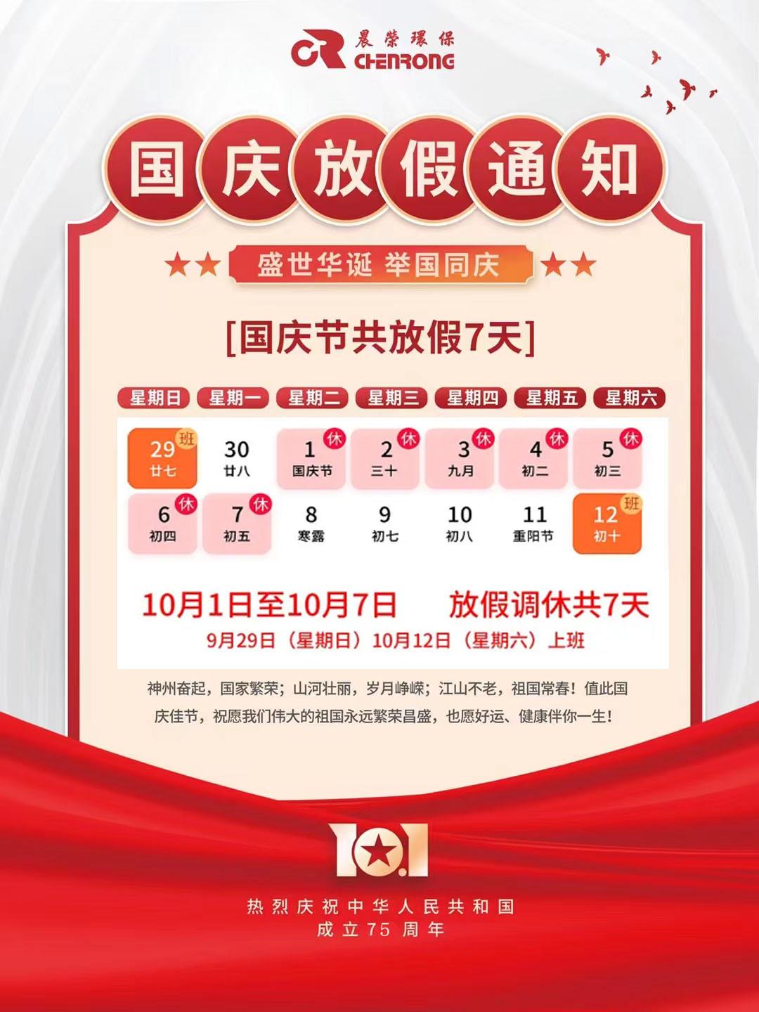 本司于2024年10月1日至7日國(guó)慶放假,共7天。在此期間依然接受詢價(jià)和下單,生產(chǎn)及發(fā)貨安排在假期以后,如給您帶來不便,敬請(qǐng)您諒解!晨榮環(huán)保全體員工提前祝大家假期快樂!